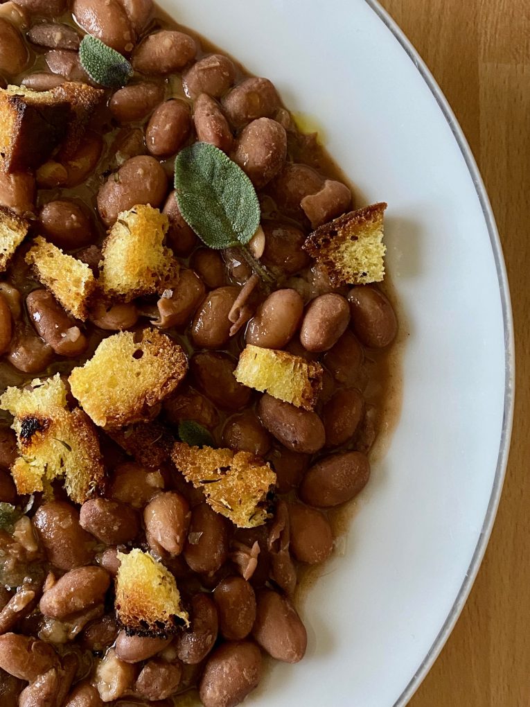 Fagioli borlotti in umido caserecci con salvia e pane tostato.